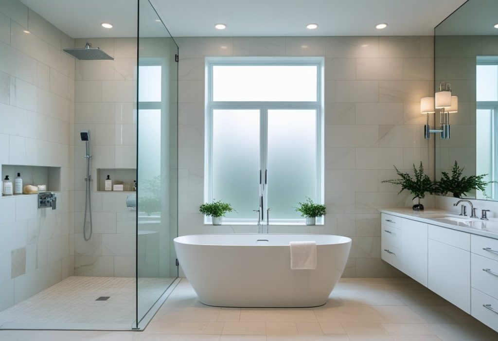 Choose minimalist hardware with clean lines and matte finishes. Large-format tiles or non-porous acrylic surrounds in neutral tones create a sleek look. Fixtures with concealed plumbing and frameless glass panels enhance the modern feel. Incorporating LED lighting around mirrors and niches adds subtle sophistication.